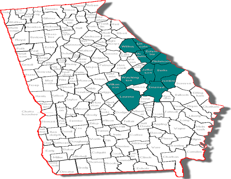 Burke, Columbia, Emanuel, Jefferson, Jenkins, Laurens, Lincoln, Mc Duffie, Richmond, Washington, Wilkes and Wilkenson.